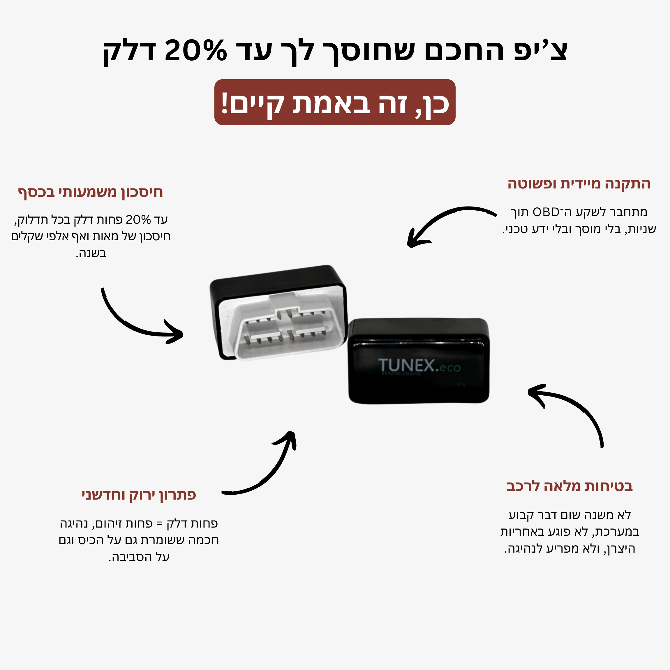כן. Tunex.eco מתחבר למחשב הרכב (ECU) ומבצע אופטימיזציה חכמה לצריכת הדלק. רוב המשתמשים רואים חיסכון של עד 20% כבר מהחודש הראשון.